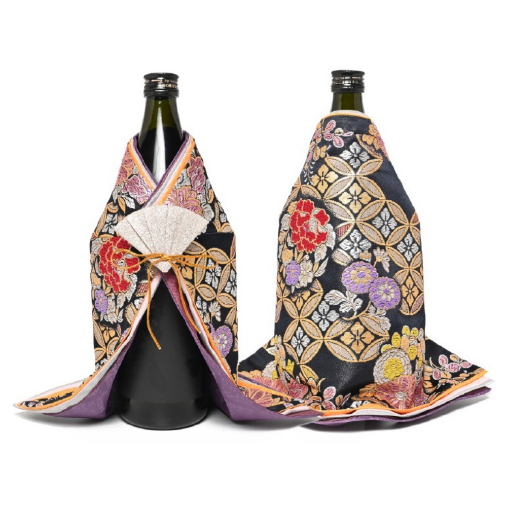 日本の伝統的な西陣織の布地を採用して1個1個手で丁寧に造り上げられたボトルカバーです。日本酒(720ml)やワイン(750ml)のボトルに被せて雛人形の様に飾る事ができます。