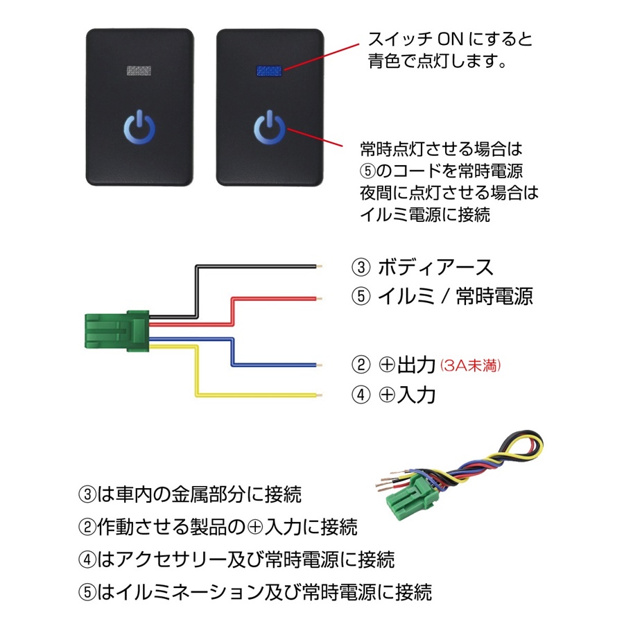 例えばFOGランプを追加したり、室内照明を演出したりと後付けで電子機器を取り付けた際にスイッチ制御する必要がありますが、純正インテリアの美観を損なわせない為にも空きポートを利用してビルトインする事が流行しております。(電流は3A未満となりますので制御する為のスイッチです。直接の電流負荷には耐えられませんのでご注意ください。)