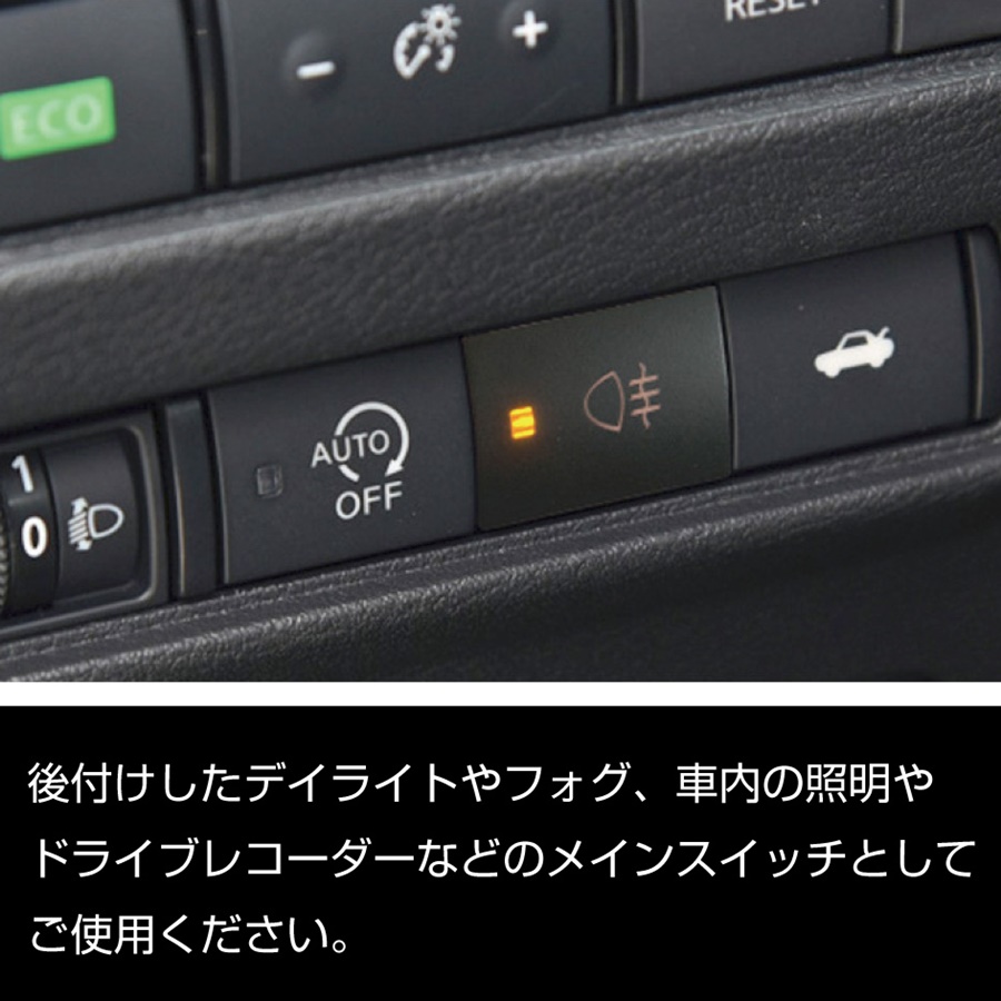 例えばFOGランプを追加したり、室内照明を演出したりと後付けで電子機器を取り付けた際にスイッチ制御する必要がありますが、純正インテリアの美観を損なわせない為にも空きポートを利用してビルトインする事が流行しております。(電流は3A未満となりますので制御する為のスイッチです。直接の電流負荷には耐えられませんのでご注意ください。)