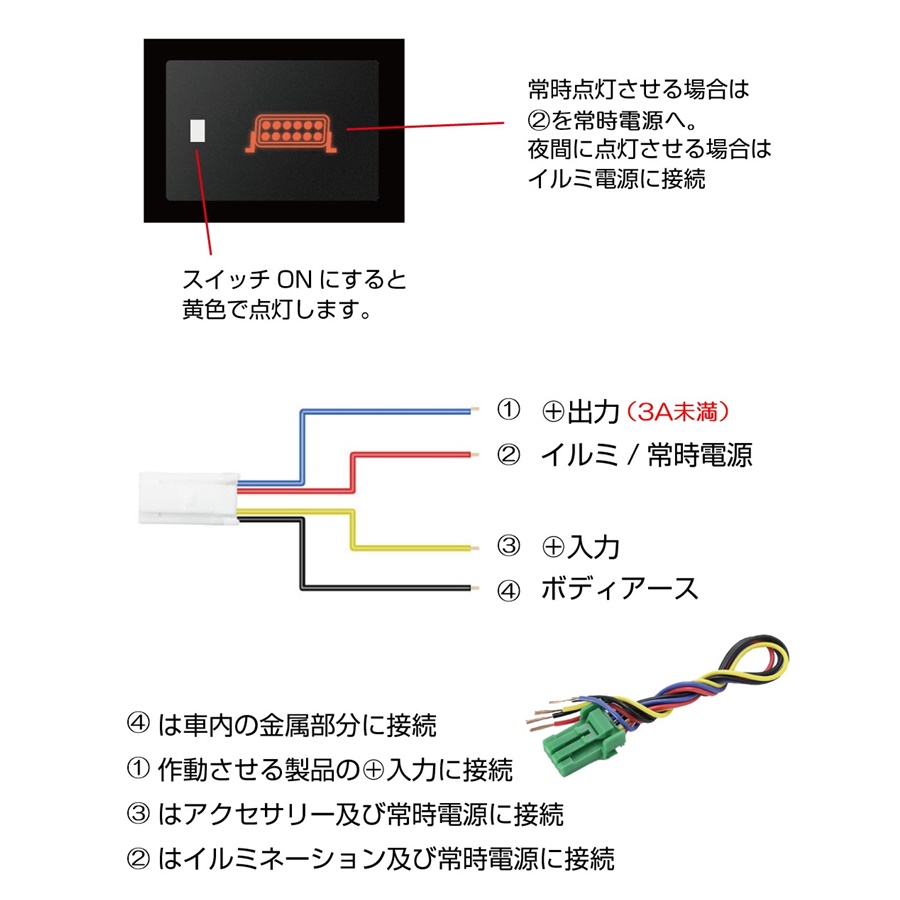 例えばFOGランプを追加したり、室内照明を演出したりと後付けで電子機器を取り付けた際にスイッチ制御する必要がありますが、純正インテリアの美観を損なわせない為にも空きポートを利用してビルトインする事が流行しております。(電流は3A未満となりますので制御する為のスイッチです。直接の電流負荷には耐えられませんのでご注意ください。)
