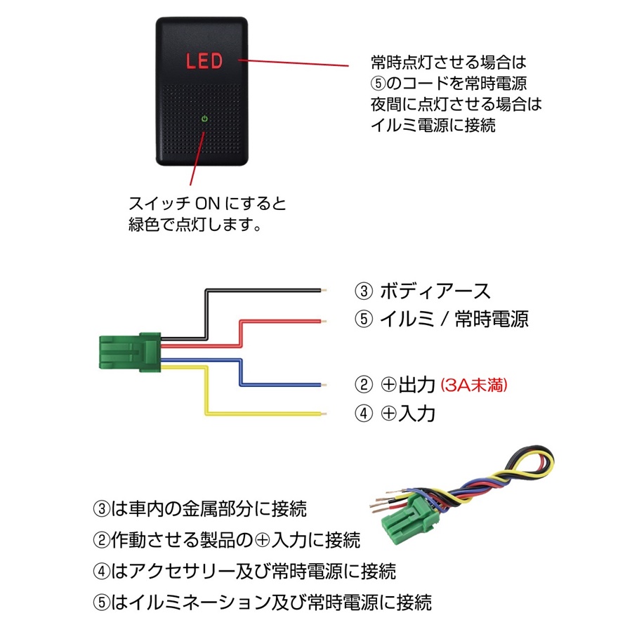 | 注意事項 | カスタムカーやキャンピングカー等の後付けスイッチとして使用するケースが多いですが加工等が必要となりますのでご了承ください。 |