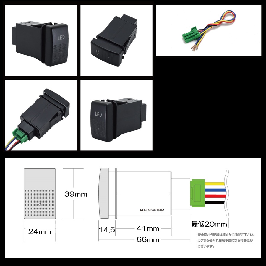 | 注意事項 | カスタムカーやキャンピングカー等の後付けスイッチとして使用するケースが多いですが加工等が必要となりますのでご了承ください。 |