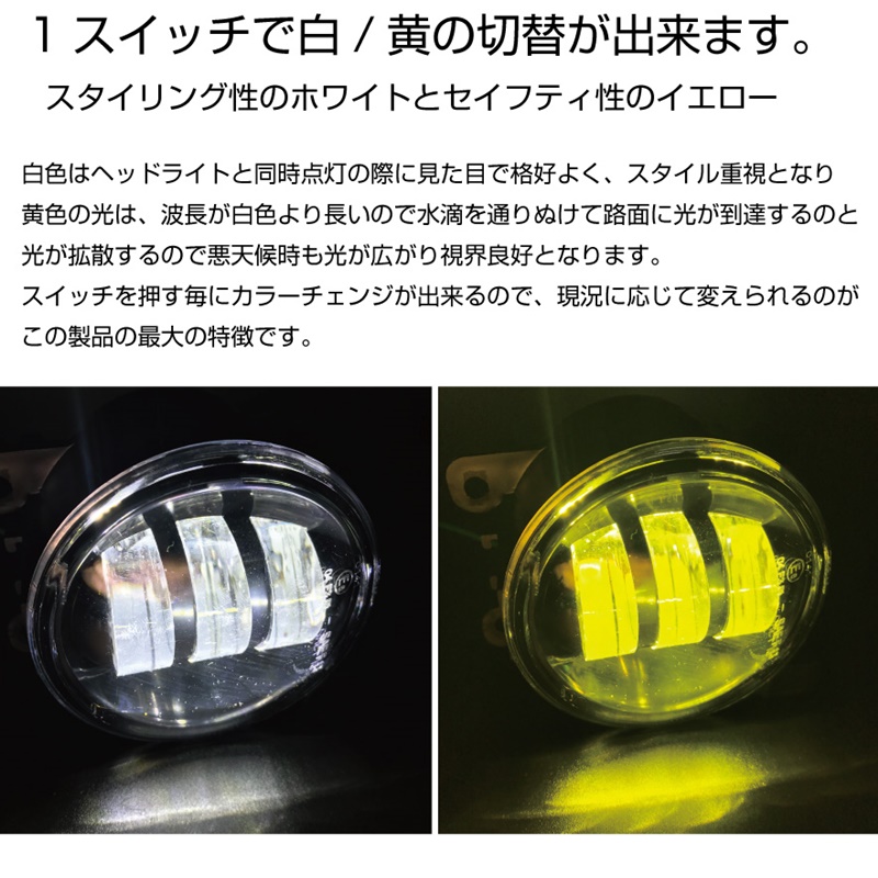 市販の切り替えスイッチ等を利用しても良いですし、スイッチを押す毎に白と黄色が切り替わりますので道路状況などに応じて使い分けるなど用途が広がります。