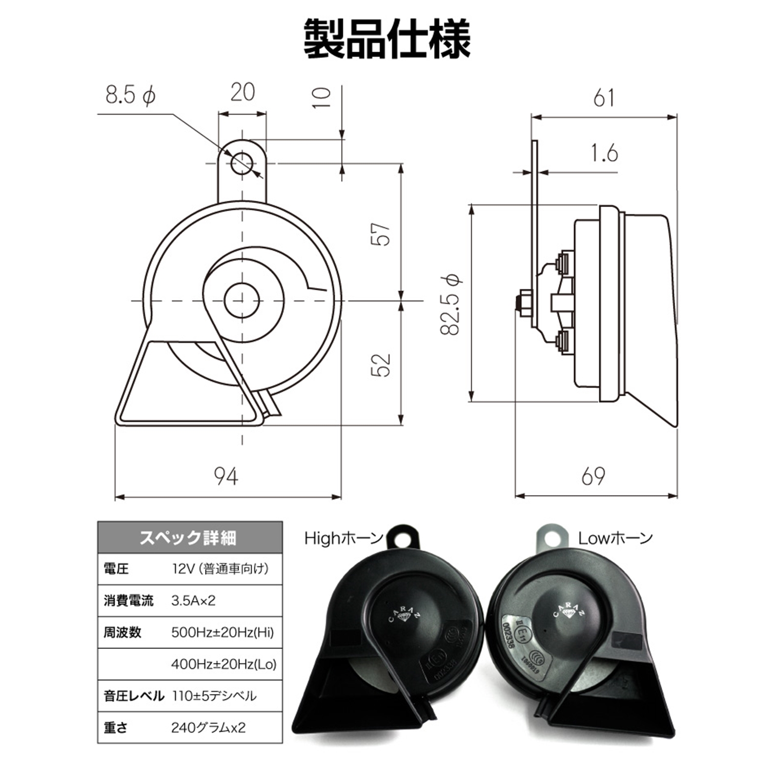 キャラッツホーンは振動板を調整して高級感があるけど威圧的では無く気品ある音色を再現したDC12V用の車載警報機(クラクション)となります。低音と高音の2個1セットとなりますので組み合わさった深みのある音を出す事が出来ます。