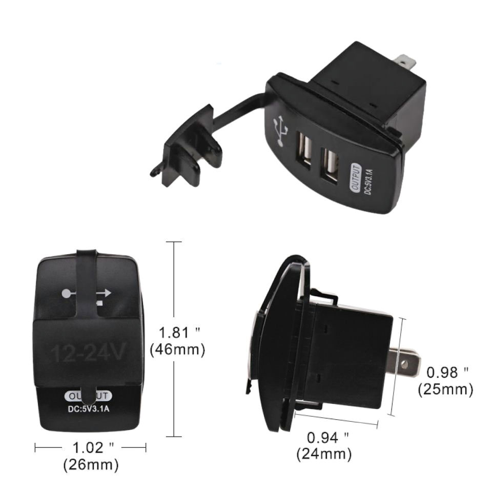 DC12V〜24Vを入力させてDC5V(1A+2.1A)に出力変換されるポートキャップ(蓋)型のUSB電源となります。
